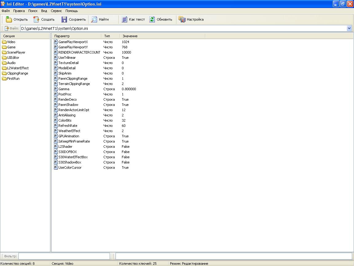 | Code [Video] GamePlayViewportX=1024 GamePlayViewportY=768 RENDERCHARACTERCOUNT=10000 UseTrilinear=True TextureDetail=0 ModelDetail=0 SkipAnim=0 P awnClippingRange=1 TerrainClippingRange=2 Gamma=0.800000 PostProc=1 RenderDeco=True PawnShadow=True RenderActorLimitOpt=12 AntiAliasi ng=2 ColorBits=32 RefreshRate=60 WeatherEffect=2 GPUAnimation=True IsKeepMinFrameRate=True L2Shader=False S30DOFBOX=False S30WaterEf fectBox=False S30ShadowBox=False UseColorCursor=True